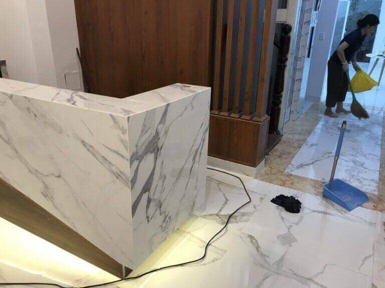 Mẫu quầy lễ tân đẹp ốp đá Bluecons tư vấn cho khách hàng