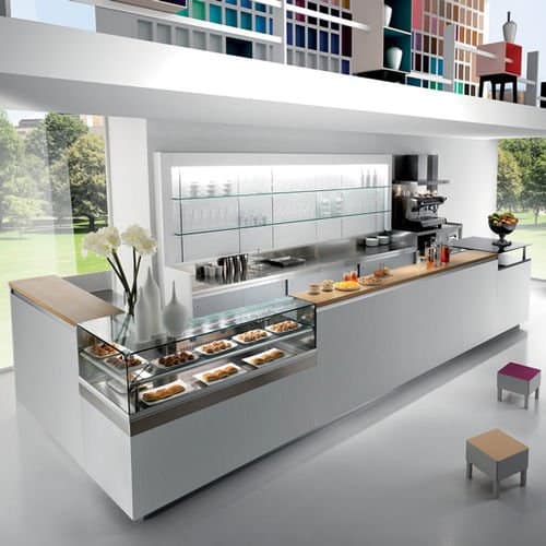 Theo hình thức thiết kế có các mẫu quầy chữ I, chữ L, quầy bán nguyệt, quầy chữ U, quầy biến thể…