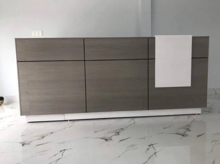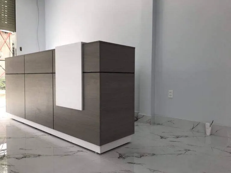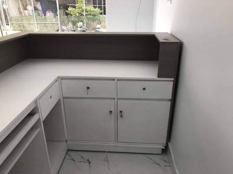 Gỗ tự nhiên, laminate, và inox đều là những lựa chọn an toàn và bền bỉ cho quầy thu ngân.