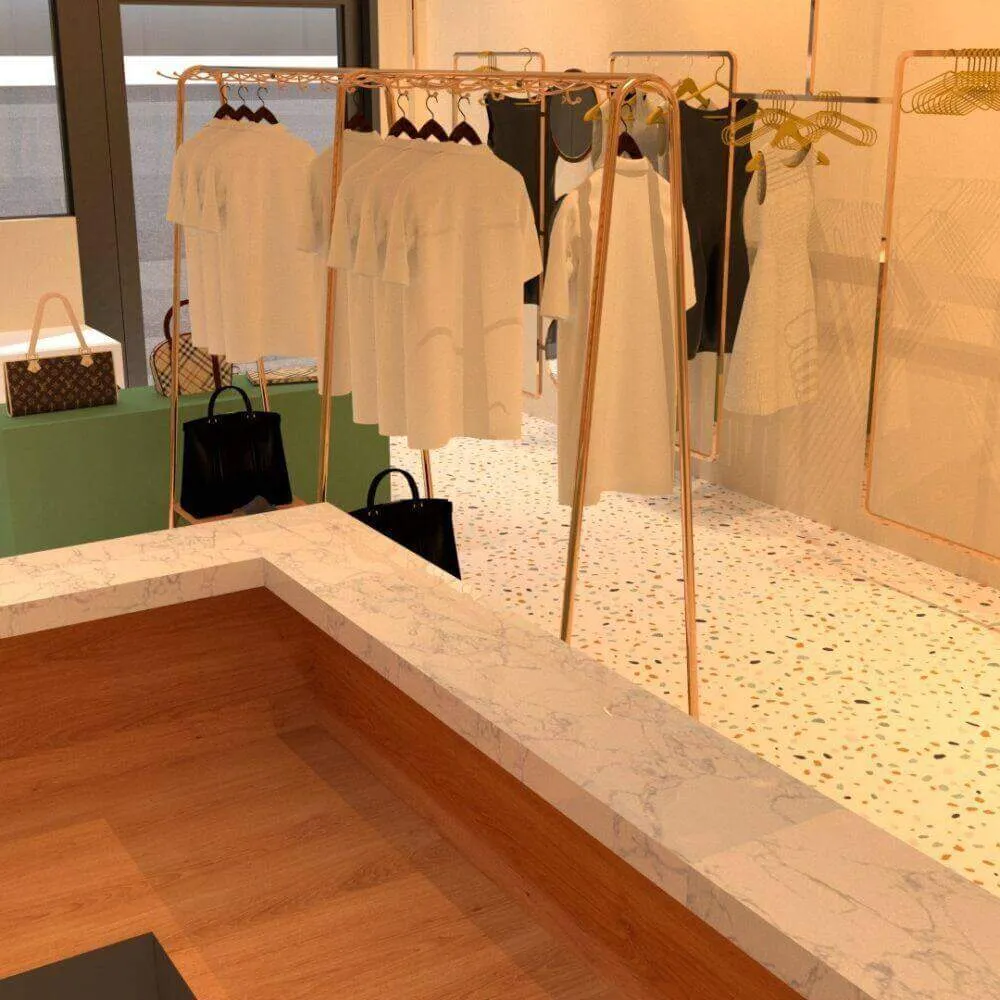 Đối với thiết kế shop thời trang nhỏ thì giá treo đồ là không thể thiếu, giá treo có nhiều loại khác nhau, có thể cố định vô tường, có thể rời và di chuyển được, các loại giá treo trong shop quần áo hiện nay thường sử dụng chất liệu là sắt tròn hoặc sắt vuông, màu giá treo sẽ phụ thuộc vào màu chủ đạo của shop, sơn bằng các loại sơn xịt thông thường hoặc sơn tĩnh điện độ bền cao chống bong tróc các lớp sơn theo thời gian.