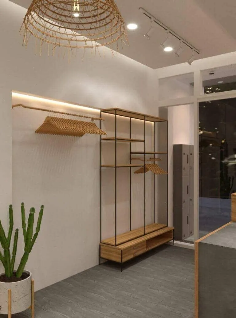 Bởi vì diện tích shop thời trang của bạn khá hạn hẹp nên không thể thiết kế shop thời trang quá nhiều chi tiết và cầu kì được. Đôi khi đơn giản lại khác biệt nhưng rất thu hút khách hàng và tiết kiệm không gian tối đa có thể.